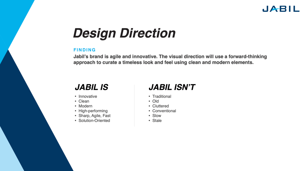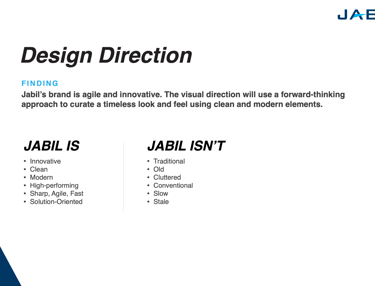 ↑ Discovery Workshop Output – Design Direction based on what we want to imply through design about what Jabil is / is not.